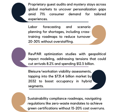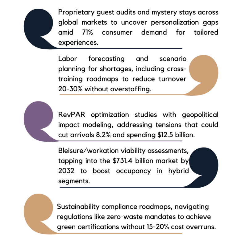 We provide customized consulting for independent hotels, resorts, restaurant groups, and experiential venues, emphasizing revenue growth and guest-centric operations. Our human-led approach includes market insights (such as guest audits and RevPAR forecasting), creative branding (like wellness repositioning and experiential campaigns), and digital tools (including personalization platforms and predictive dashboards). We address your unique needs, from boosting occupancy in uneven recoveries to integrating tech without losing the personal touch that defines hospitality.