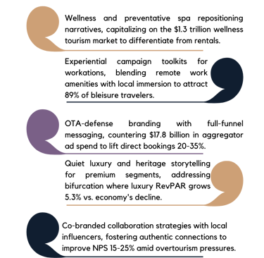 Authentic narratives that resonate in a personalized world: wellness-focused repositioning, experiential campaigns for workations, and visual storytelling that cuts through OTA noise.