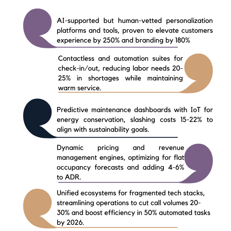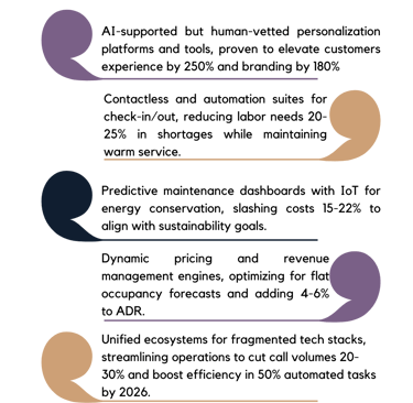Guest-centric tech integrations, from AI-supported personalization to contactless platforms, designed for seamless operations without overshadowing human service.