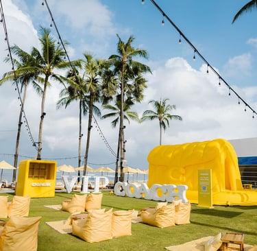 Our approach kicked off with thorough market research, examining pop-up trends in Southeast Asia. Data revealed a 55% surge in interactive retail experiences in 2023, with younger consumers favoring brands that blend fun with exclusivity. We highlighted Coach's edge: personalization amid Bali's leisure scene, as 65% of affluent travelers seek unique, shareable moments. This informed the pop-up's layout, from a giant bouncy Tabby inflatable to themed games like cornhole, all designed to embody optimism and courage as voiced in the brand's virtual campaign featuring ambassador Lee Youngji.