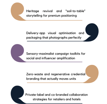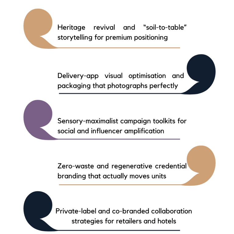 We start with your story: crafting positioning that highlights authenticity, like "soil-to-table" narratives for premium appeal. From there, we develop campaigns, messaging, and visual assets tailored to channels like delivery apps or social media. For F&B, this might mean sensory-maximalist packaging that photographs well or zero-waste credentials that resonate with health-conscious buyers. We aim for measurable results, such as tripling DTC sales, and we double-check every element against consumer data to avoid generic approaches.