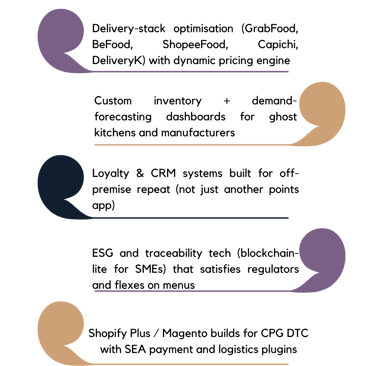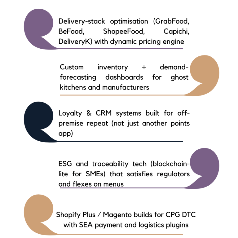 We fix these with senior experts who’ve run restaurants, launched CPG lines, and scaled cloud kitchens, optimized streamline operation, operated food delivery service apps such as GrabFood and Capichi, no juniors, no templates.