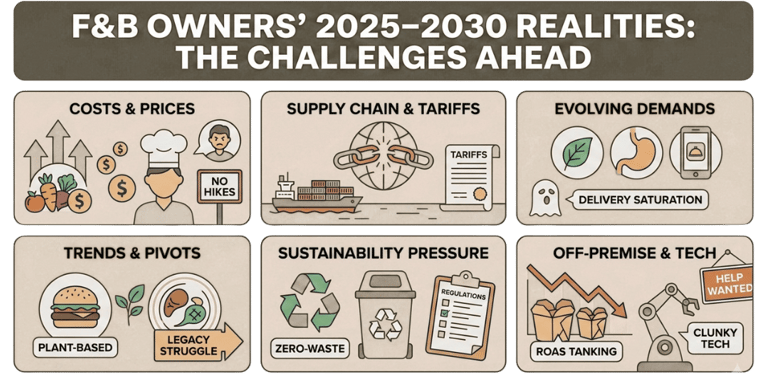 You’re not alone, these are the realities keeping F&B owners up at night in 2025–2030, backed by the latest industry reports that we, at BDP+Partners, have thoroughly cross-checked (e.g., Circana's 2025-2026 outlook showing slowing volume growth amid persistent inflation, Innova's global trends highlighting anxiety-driven demands for health and sustainability, and regional SEA analyses pointing to rapid digital shifts clashing with operational strains).
